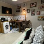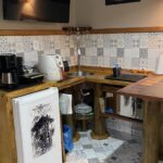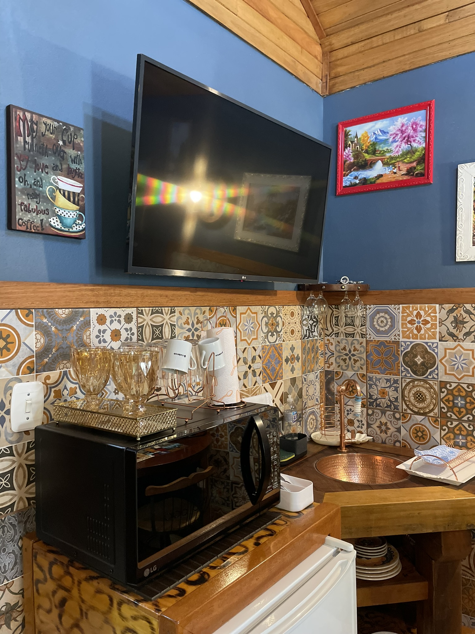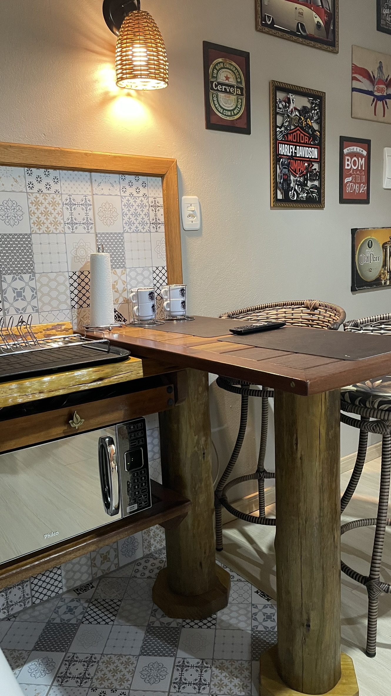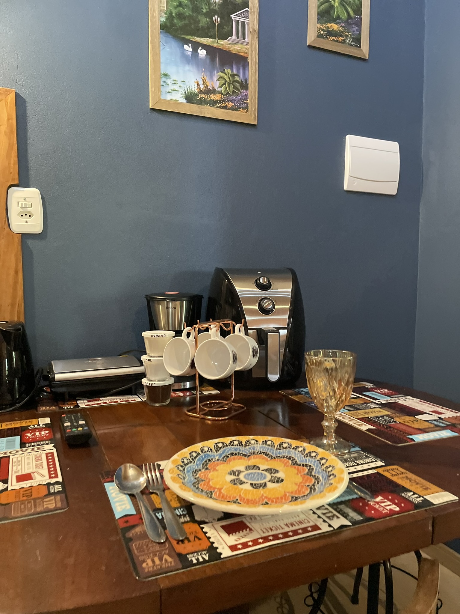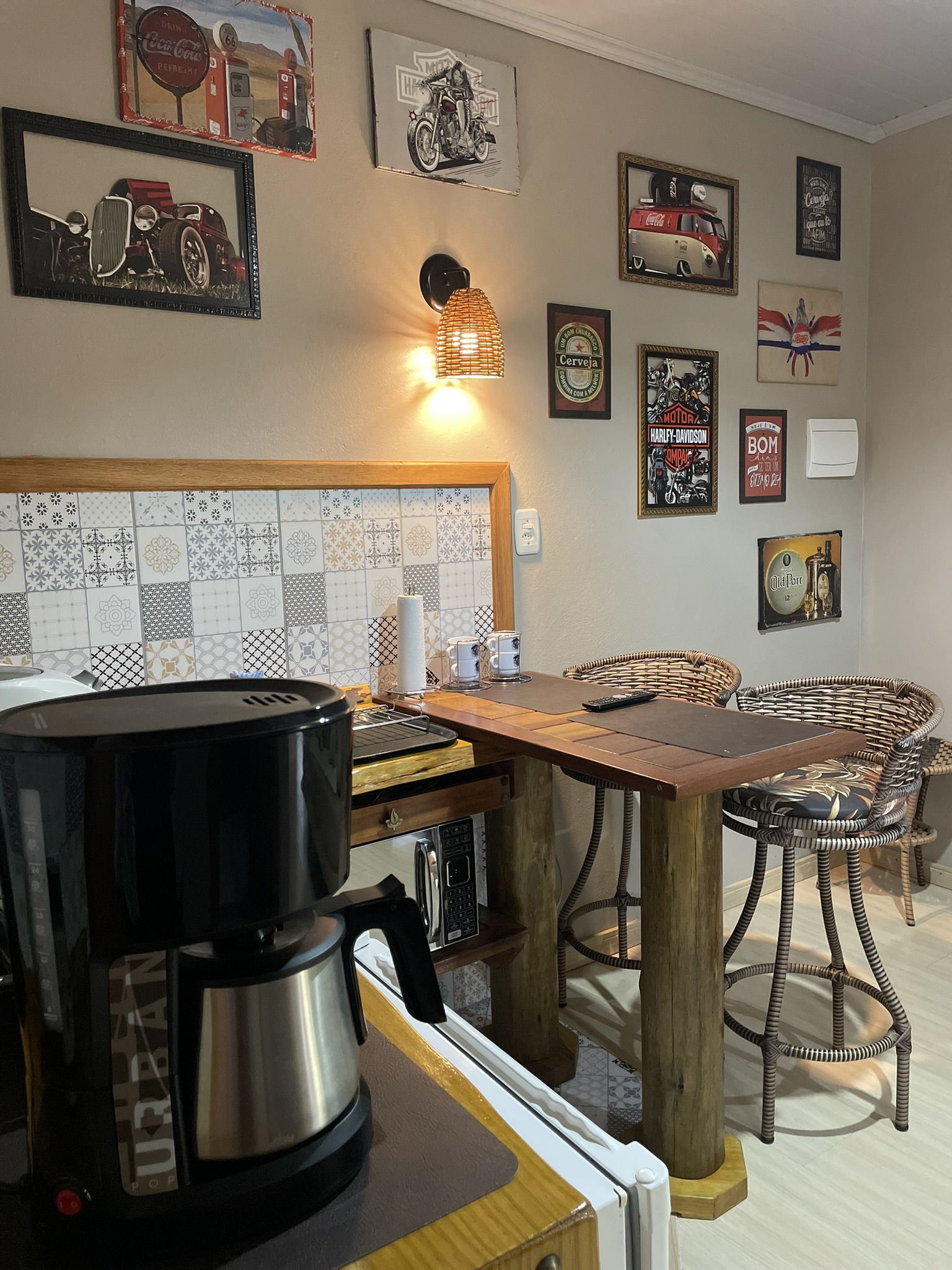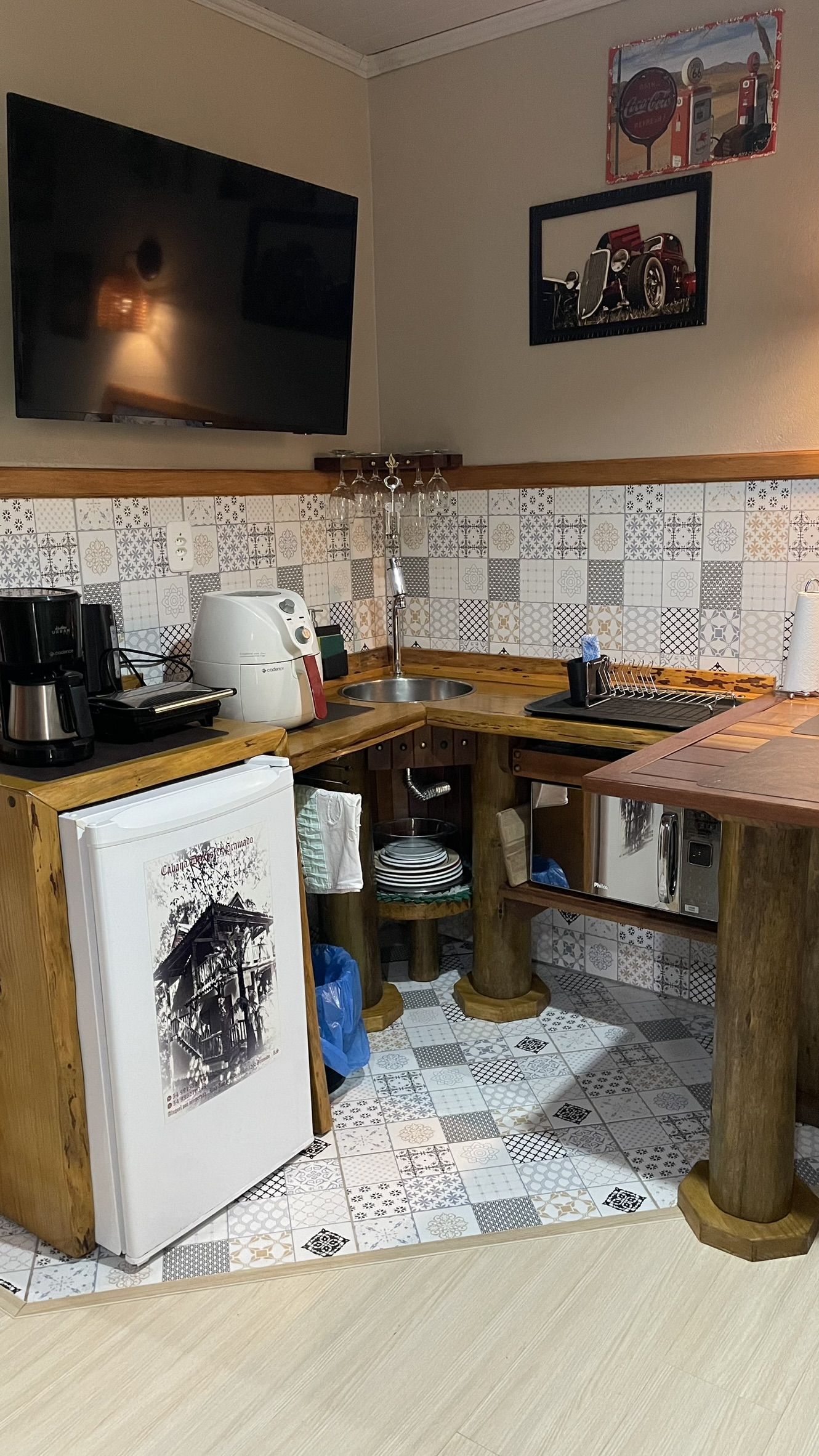 Frigobar, cafeteira, air fryer, torradeira, jarra elétrica, microondas, louças (sem fogão)
