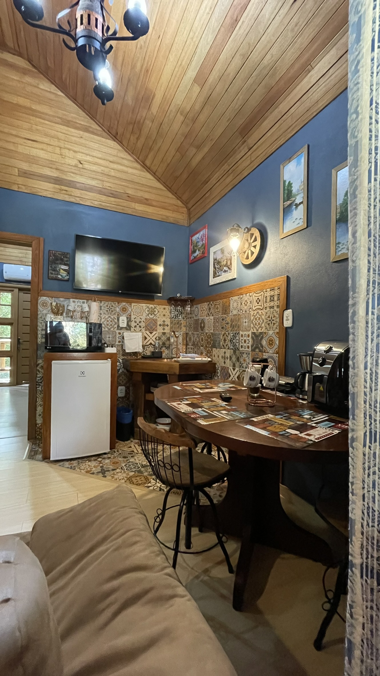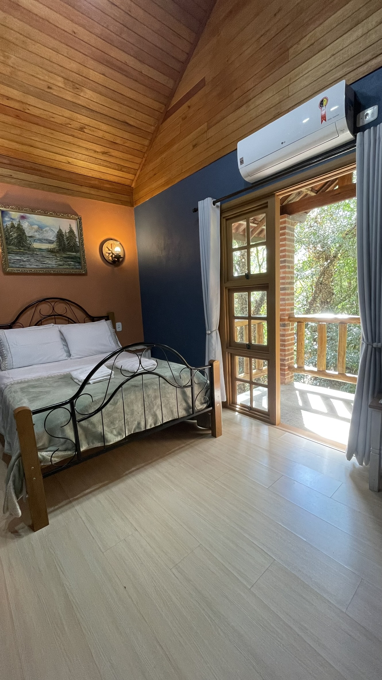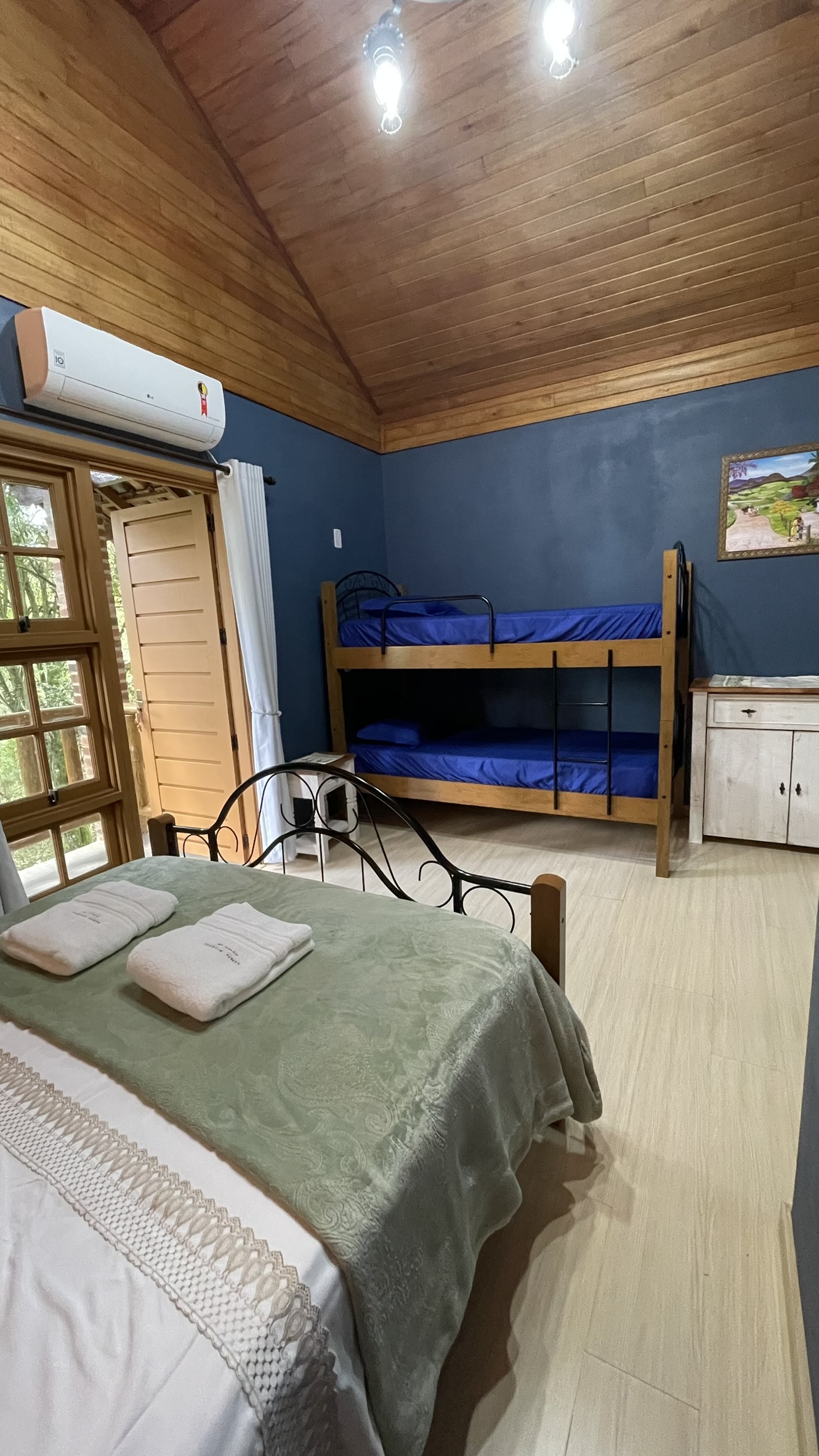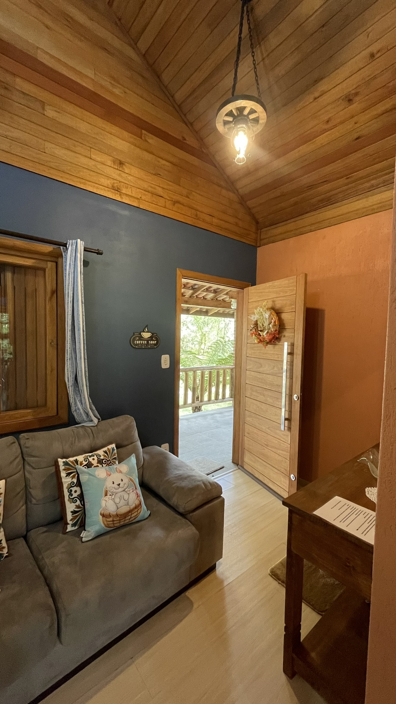 Cabana familiar acomoda até 4 pessoas, possui 1 quarto com ar condicionado, com 1 cama de casal e 1 beliche, cozinha equipada com frigobar, cafeteira, air fryer, torradeira, jarra elétrica, microondas, além de lindas louças para suas refeições, a cabana conta com sofá e TV na sala, além de sacadas com lindas vistas para o verde.