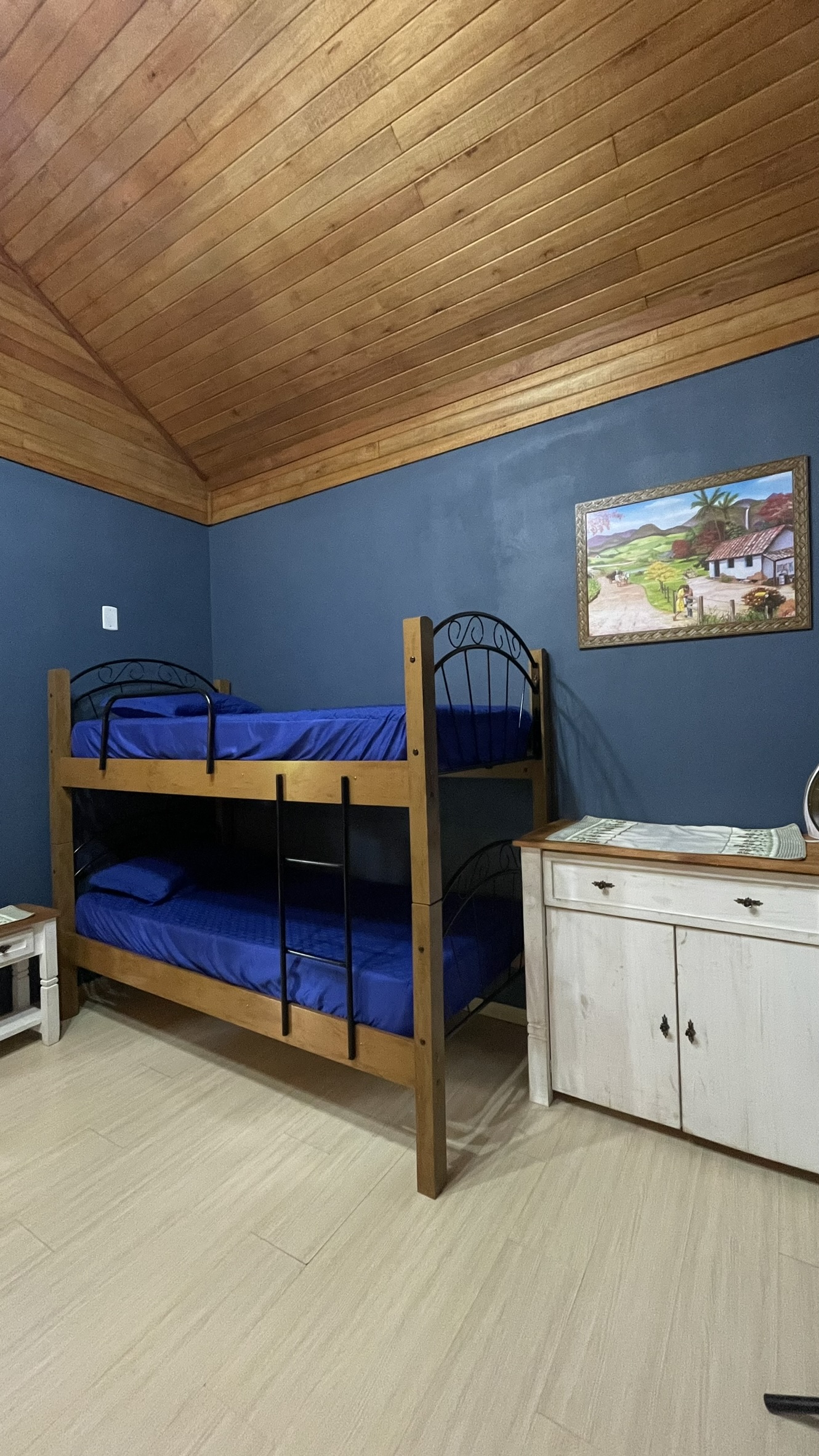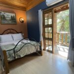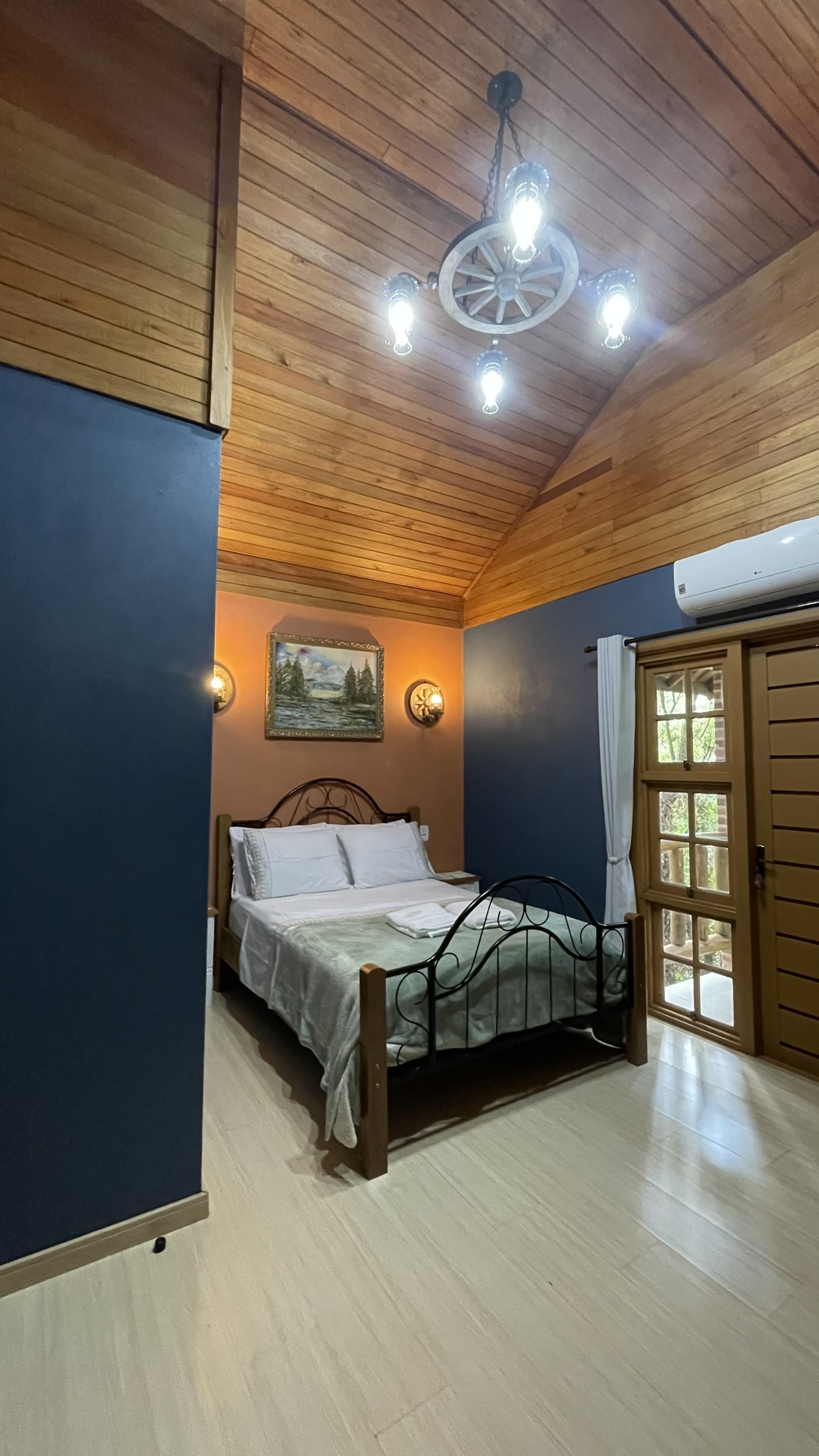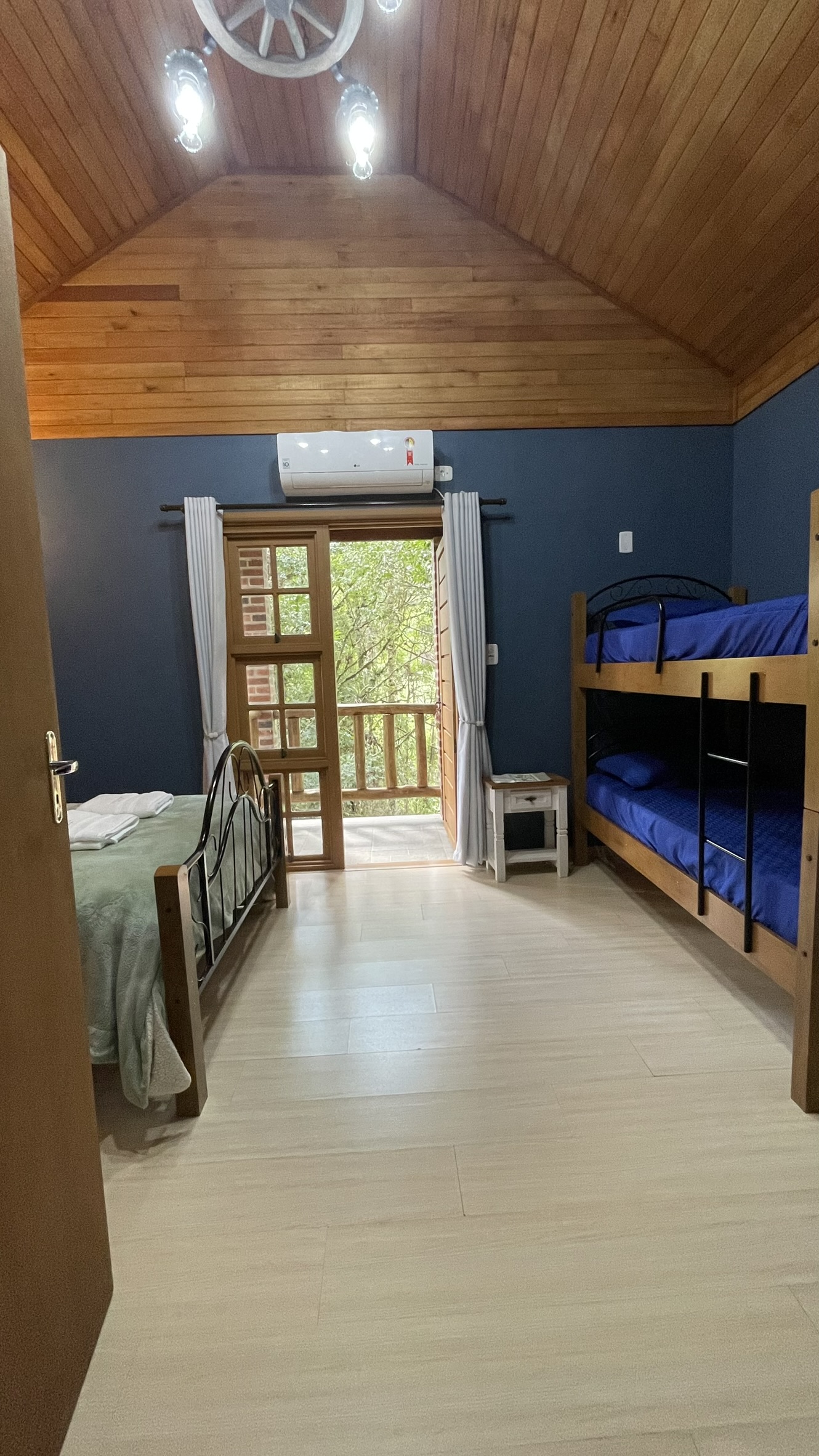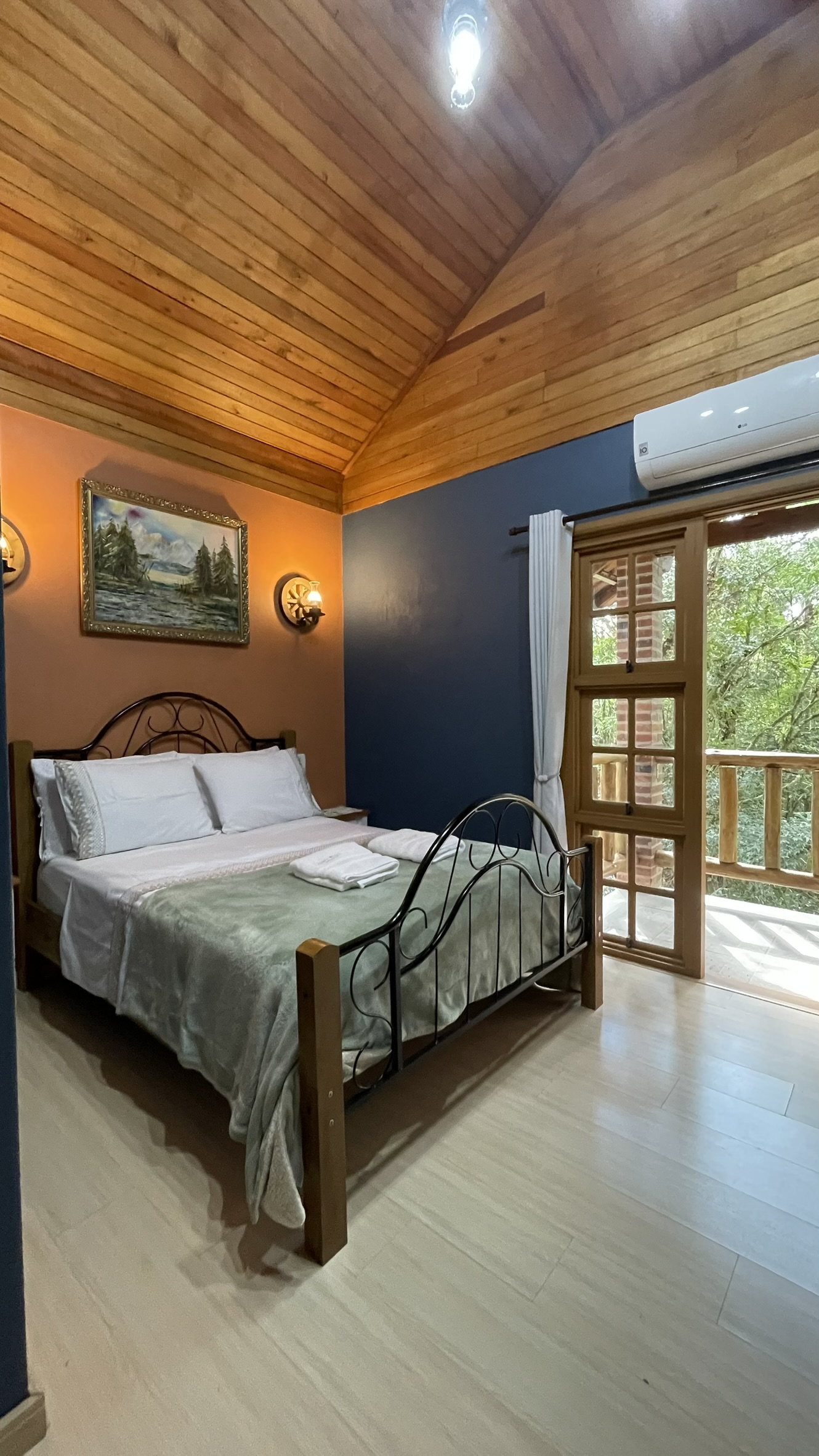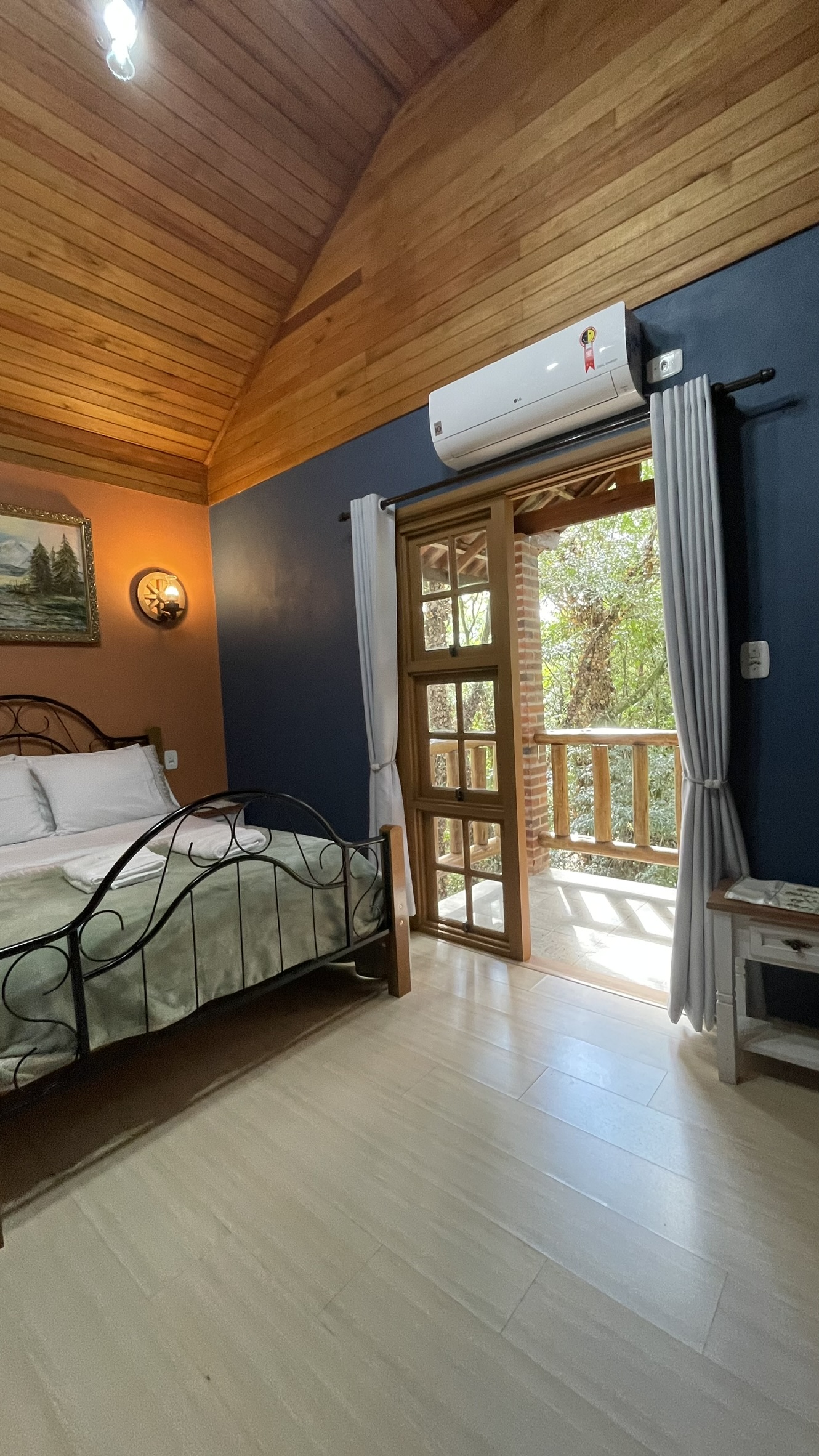Cabana familiar acomoda até 4 pessoas, possui 1 quarto com ar condicionado, com 1 cama de casal e 1 beliche, cozinha equipada com frigobar, cafeteira, air fryer, torradeira, jarra elétrica, microondas, além de lindas louças para suas refeições, a cabana conta com sofá e TV na sala, além de sacadas com lindas vistas para o verde.