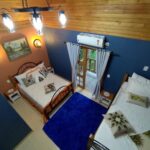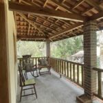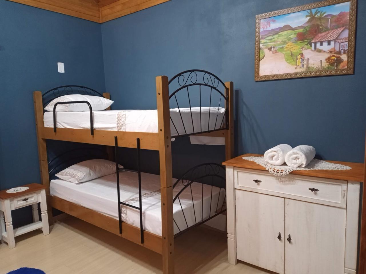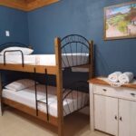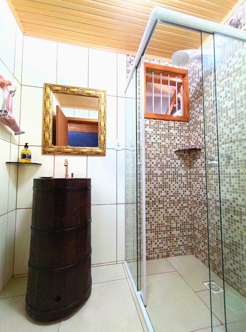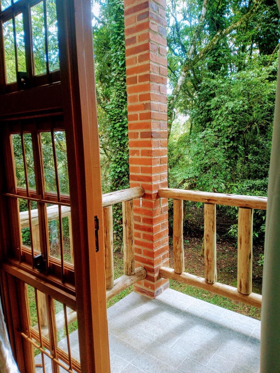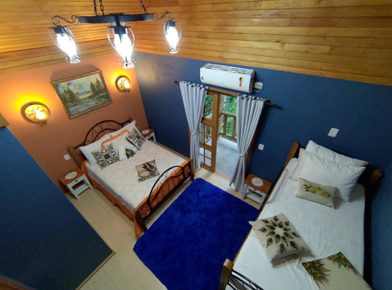 Cabana familiar acomoda até 4 pessoas, possui 1 quarto com ar condicionado, com 1 cama de casal e 1 beliche, cozinha equipada com frigobar, cafeteira, air fryer, torradeira, jarra elétrica, microondas, além de lindas louças para suas refeições, a cabana conta com sofá e TV na sala, além de sacadas com lindas vistas para o verde.
